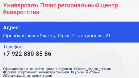 Универсалъ Плюс, региональный центр банкротства по адресу Оренбургская область, Орск, Станционная, 21 в дальнейшем Организация, размещена в следующих категориях: