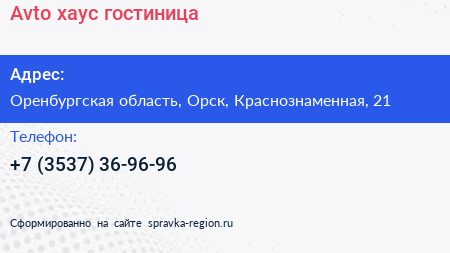 Avto хаус, гостиница по адресу Оренбургская область, Орск, Краснознаменная, 21 в дальнейшем Организация, размещена в следующих категориях: