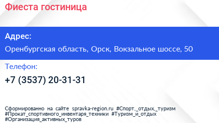 Фиеста, гостиница по адресу Оренбургская область, Орск, Вокзальное шоссе, 50 в дальнейшем Организация, размещена в следующих категориях: