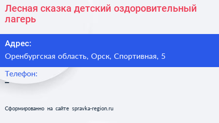 Лесная сказка, детский оздоровительный лагерь по адресу Оренбургская область, Орск, Спортивная, 5 в дальнейшем Организация, размещена в следующих категориях: