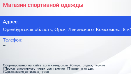 Магазин спортивной одежды по адресу Оренбургская область, Орск, Ленинского Комсомола, 8 к1 в дальнейшем Организация, размещена в следующих категориях: