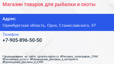 Магазин товаров для рыбалки и охоты по адресу Оренбургская область, Орск, Станиславского, 47 в дальнейшем Организация, размещена в следующих категориях: