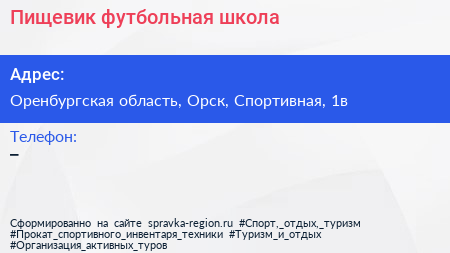 Пищевик, футбольная школа по адресу Оренбургская область, Орск, Спортивная, 1в в дальнейшем Организация, размещена в следующих категориях: