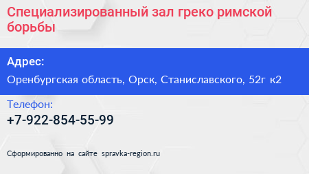 Специализированный зал греко-римской борьбы по адресу Оренбургская область, Орск, Станиславского, 52г к2 в дальнейшем Организация, размещена в следующих категориях: