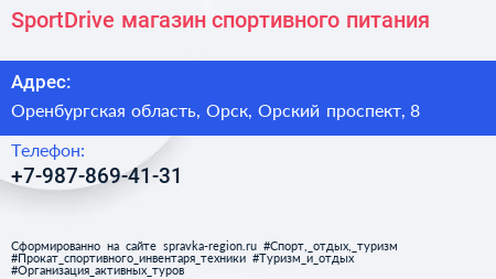SportDrive, магазин спортивного питания по адресу Оренбургская область, Орск, Орский проспект, 8 в дальнейшем Организация, размещена в следующих категориях: