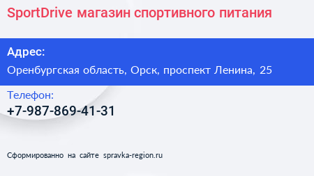 SportDrive, магазин спортивного питания по адресу Оренбургская область, Орск, проспект Ленина, 25 в дальнейшем Организация, размещена в следующих категориях: