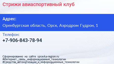 Стрижи, авиаспортивный клуб по адресу Оренбургская область, Орск, Аэродром Гудрон, 1 в дальнейшем Организация, размещена в следующих категориях: