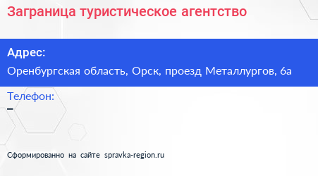 Заграница, туристическое агентство по адресу Оренбургская область, Орск, проезд Металлургов, 6а в дальнейшем Организация, размещена в следующих категориях: