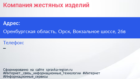 Компания жестяных изделий по адресу Оренбургская область, Орск, Вокзальное шоссе, 26в в дальнейшем Организация, размещена в следующих категориях: