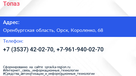 Топаз по адресу Оренбургская область, Орск, Короленко, 68 в дальнейшем Организация, размещена в следующих категориях: