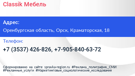 Classik Мебель по адресу Оренбургская область, Орск, Краматорская, 18 в дальнейшем Организация, размещена в следующих категориях: