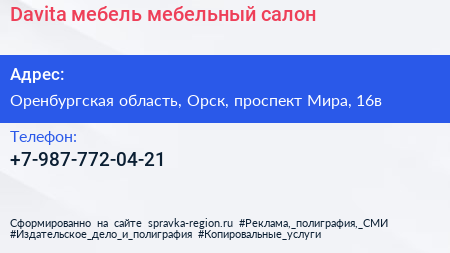 Davita-мебель, мебельный салон по адресу Оренбургская область, Орск, проспект Мира, 16в в дальнейшем Организация, размещена в следующих категориях: