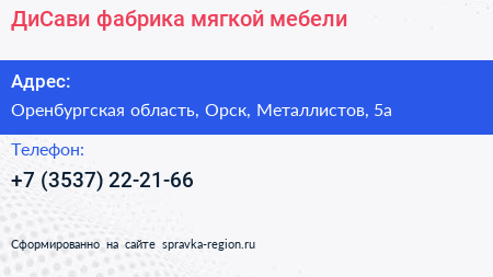 ДиСави, фабрика мягкой мебели по адресу Оренбургская область, Орск, Металлистов, 5а в дальнейшем Организация, размещена в следующих категориях: