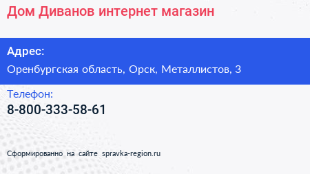 Дом Диванов, интернет-магазин по адресу Оренбургская область, Орск, Металлистов, 3 в дальнейшем Организация, размещена в следующих категориях: