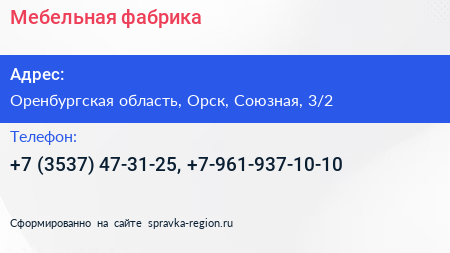 Мебельная фабрика по адресу Оренбургская область, Орск, Союзная, 3/2 в дальнейшем Организация, размещена в следующих категориях:
