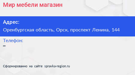 Мир мебели, магазин по адресу Оренбургская область, Орск, проспект Ленина, 144 в дальнейшем Организация, размещена в следующих категориях: