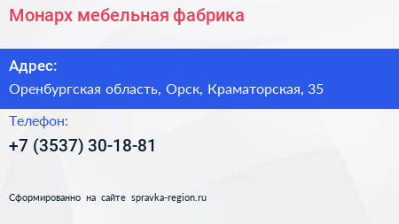 Монарх, мебельная фабрика по адресу Оренбургская область, Орск, Краматорская, 35 в дальнейшем Организация, размещена в следующих категориях:
