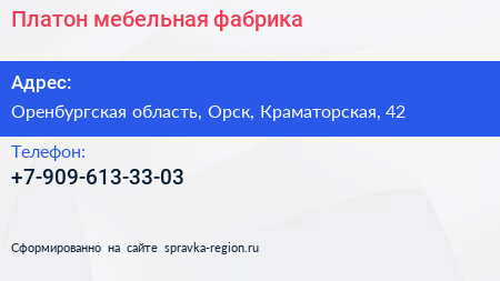 Платон, мебельная фабрика по адресу Оренбургская область, Орск, Краматорская, 42 в дальнейшем Организация, размещена в следующих категориях: