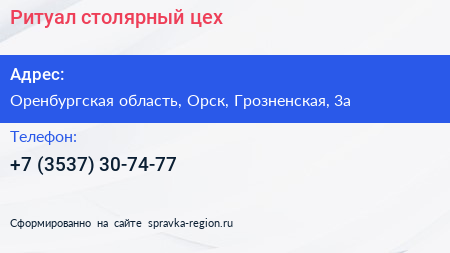 Ритуал, столярный цех по адресу Оренбургская область, Орск, Грозненская, 3а в дальнейшем Организация, размещена в следующих категориях: