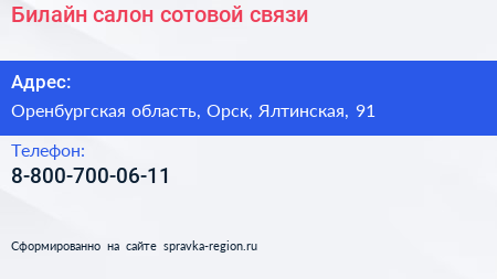 Билайн, салон сотовой связи по адресу Оренбургская область, Орск, Ялтинская, 91 в дальнейшем Организация, размещена в следующих категориях: