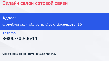Билайн, салон сотовой связи по адресу Оренбургская область, Орск, Васнецова, 16 в дальнейшем Организация, размещена в следующих категориях: