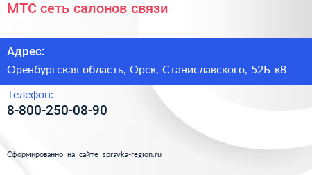 МТС, сеть салонов связи по адресу Оренбургская область, Орск, Станиславского, 52Б к8 в дальнейшем Организация, размещена в следующих категориях: