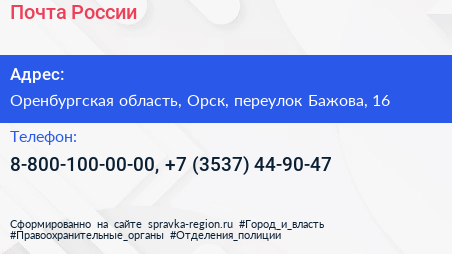 Почта России по адресу Оренбургская область, Орск, переулок Бажова, 16 в дальнейшем Организация, размещена в следующих категориях: