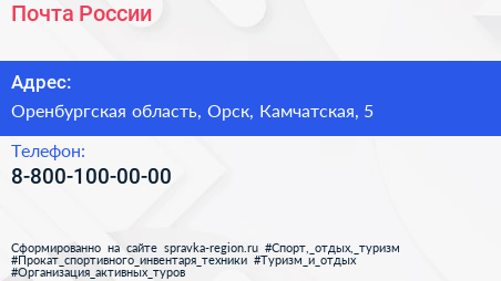 Почта России по адресу Оренбургская область, Орск, Камчатская, 5 в дальнейшем Организация, размещена в следующих категориях: