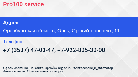 Pro100 service по адресу Оренбургская область, Орск, Орский проспект, 11 в дальнейшем Организация, размещена в следующих категориях:
