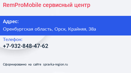 RemProMobile, сервисный центр по адресу Оренбургская область, Орск, Крайняя, 38а в дальнейшем Организация, размещена в следующих категориях: