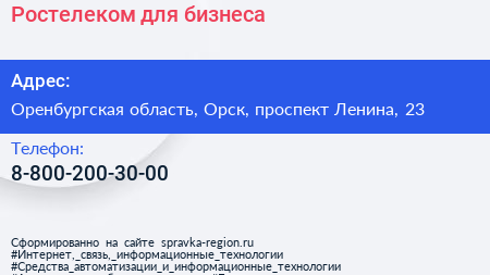 Ростелеком для бизнеса по адресу Оренбургская область, Орск, проспект Ленина, 23 в дальнейшем Организация, размещена в следующих категориях: