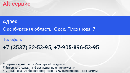 Alt сервис по адресу Оренбургская область, Орск, Плеханова, 7 в дальнейшем Организация, размещена в следующих категориях:
