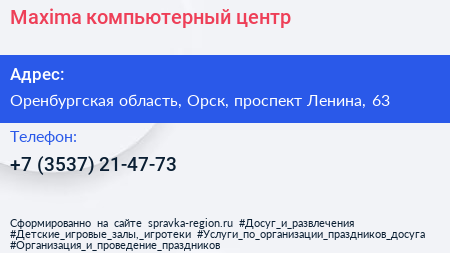 Maxima, компьютерный центр по адресу Оренбургская область, Орск, проспект Ленина, 63 в дальнейшем Организация, размещена в следующих категориях: