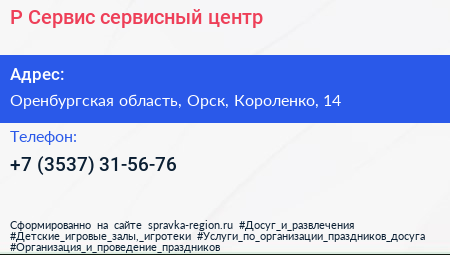Р-Сервис, сервисный центр по адресу Оренбургская область, Орск, Короленко, 14 в дальнейшем Организация, размещена в следующих категориях:
