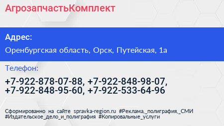 АгрозапчастьКомплект по адресу Оренбургская область, Орск, Путейская, 1а в дальнейшем Организация, размещена в следующих категориях: