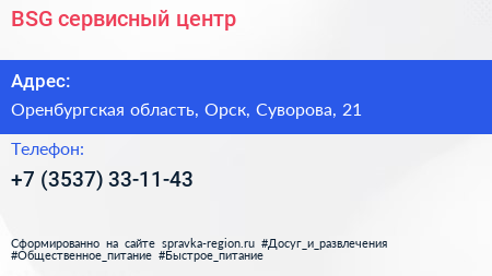 BSG, сервисный центр по адресу Оренбургская область, Орск, Суворова, 21 в дальнейшем Организация, размещена в следующих категориях: