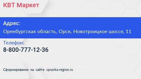 КВТ Маркет по адресу Оренбургская область, Орск, Новотроицкое шоссе, 11 в дальнейшем Организация, размещена в следующих категориях: