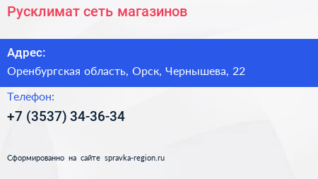 Русклимат, сеть магазинов по адресу Оренбургская область, Орск, Чернышева, 22 в дальнейшем Организация, размещена в следующих категориях: