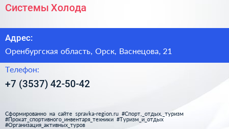 Системы Холода по адресу Оренбургская область, Орск, Васнецова, 21 в дальнейшем Организация, размещена в следующих категориях:
