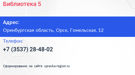 Библиотека №5 по адресу Оренбургская область, Орск, Гомельская, 12 в дальнейшем Организация, размещена в следующих категориях: