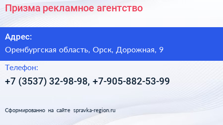Призма, рекламное агентство по адресу Оренбургская область, Орск, Дорожная, 9 в дальнейшем Организация, размещена в следующих категориях: