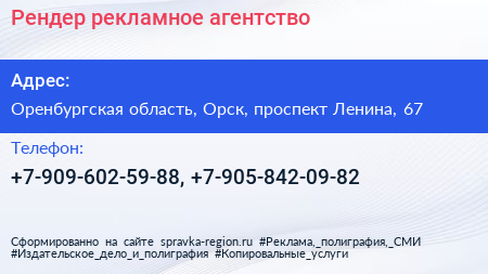 Рендер, рекламное агентство по адресу Оренбургская область, Орск, проспект Ленина, 67 в дальнейшем Организация, размещена в следующих категориях: