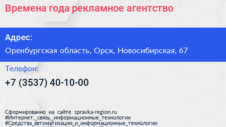Времена года, рекламное агентство по адресу Оренбургская область, Орск, Новосибирская, 67 в дальнейшем Организация, размещена в следующих категориях: