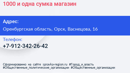 1000 и одна сумка, магазин по адресу Оренбургская область, Орск, Васнецова, 16 в дальнейшем Организация, размещена в следующих категориях: