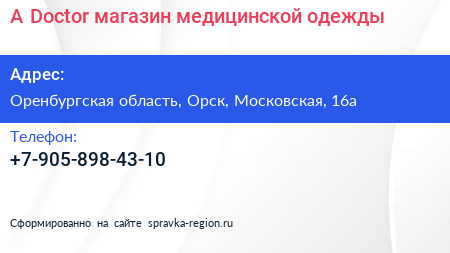 А`Doctor, магазин медицинской одежды по адресу Оренбургская область, Орск, Московская, 16а в дальнейшем Организация, размещена в следующих категориях: