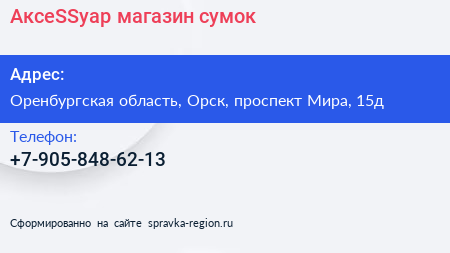 АксеSSуар, магазин сумок по адресу Оренбургская область, Орск, проспект Мира, 15д в дальнейшем Организация, размещена в следующих категориях: