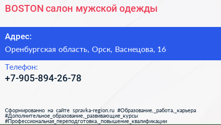 BOSTON, салон мужской одежды по адресу Оренбургская область, Орск, Васнецова, 16 в дальнейшем Организация, размещена в следующих категориях: