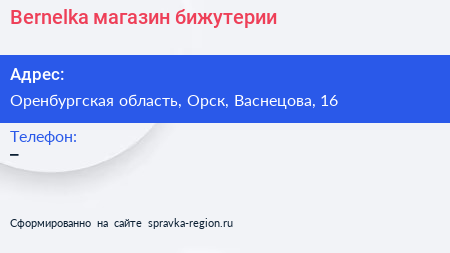Bernelka, магазин бижутерии по адресу Оренбургская область, Орск, Васнецова, 16 в дальнейшем Организация, размещена в следующих категориях: