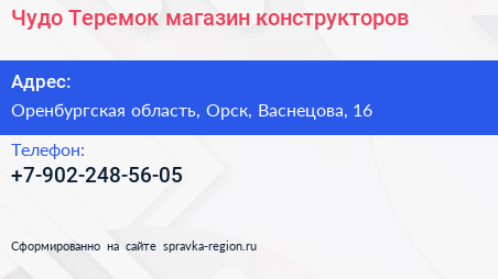 Чудо-Теремок, магазин конструкторов по адресу Оренбургская область, Орск, Васнецова, 16 в дальнейшем Организация, размещена в следующих категориях: