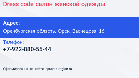 Dress code, салон женской одежды по адресу Оренбургская область, Орск, Васнецова, 16 в дальнейшем Организация, размещена в следующих категориях: